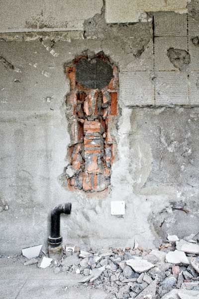 La construcción real empieza con nuevas aperturas para puertas, levantando paredes y añadiendo ventanas. Además, se colocan las bases de los sistemas necesarios, como cables eléctricos y tuberías de agua.